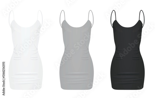 Набор макетов черного, белого и красного платьев, векторная иллюстрация, изолированная на прозрачном фоне. Реалистичные элегантные платья-карандаши. Женская одежда, женская одежда и мода.
