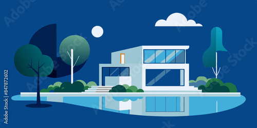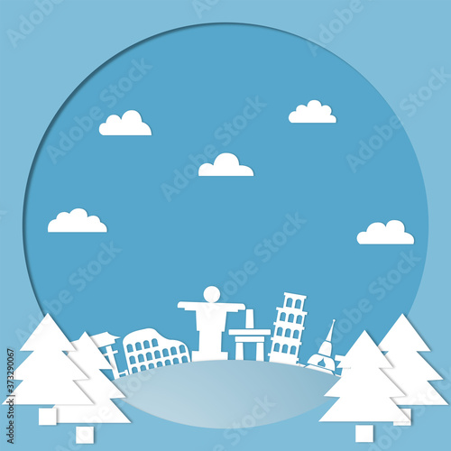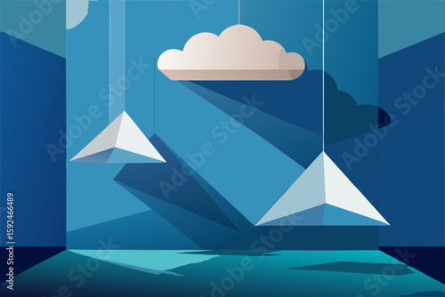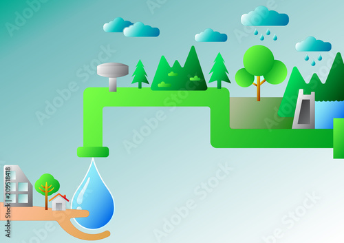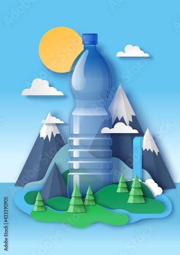 Пустая пластиковая бутылка для питьевой воды, вырезанные из бумаги горы, лесные деревья, векторная иллюстрация. Шаблон рекламы чистой питьевой воды.