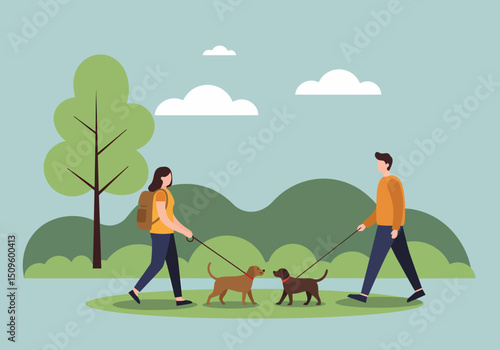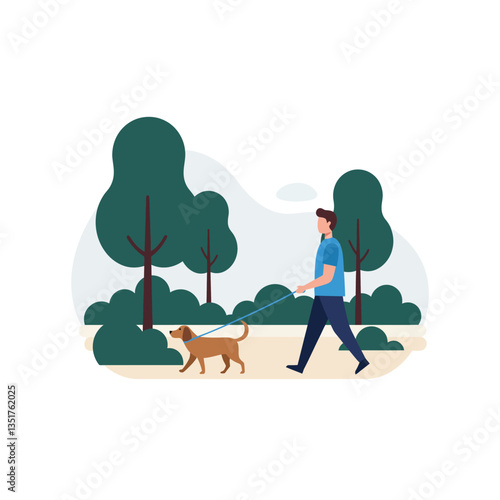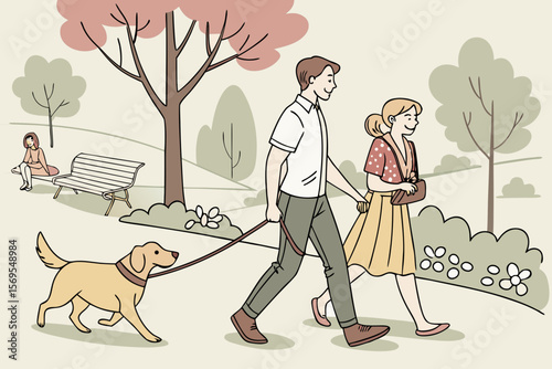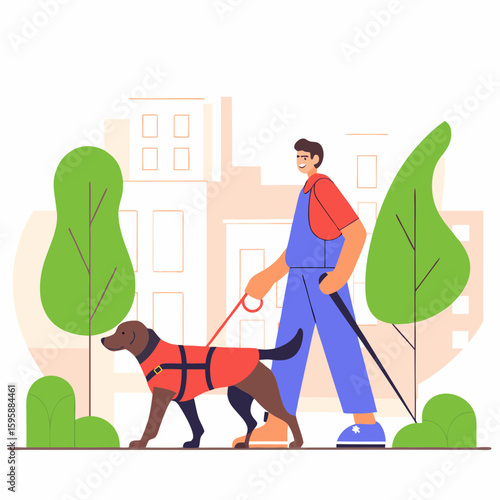 Слепая женщина, идущая с палкой и собакой-поводырем в городском парке, плоская векторная иллюстрация. Девушка-инвалид с собакой-компаньоном. Помощь с домашними животными для людей с нарушениями зрения.
