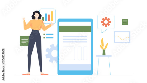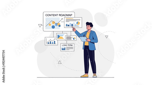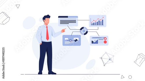 Векторная иллюстрация бизнесмена, выступающего с презентацией того, что такое технология блокчейн, с использованием наглядных пособий. Концепция деловой конференции. Дизайн в плоском стиле.