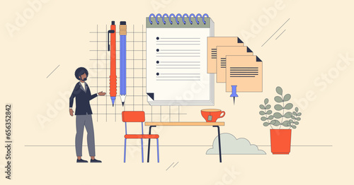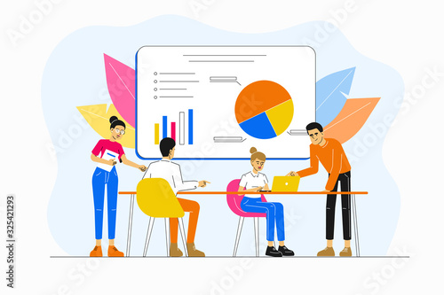 Концепция книжного производства векторная иллюстрация дизайна в плоском стиле. Большая открытая книга и крошечные персонажи - команда людей, вовлеченных в издательский процесс. Услуги издательства или компании.