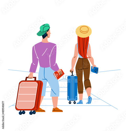 Пограничник, запрещающий пересекать дорогу векторная иллюстрация. Люди с багажной сумкой ждут открытия пути. Концепция официальных ограничений страны