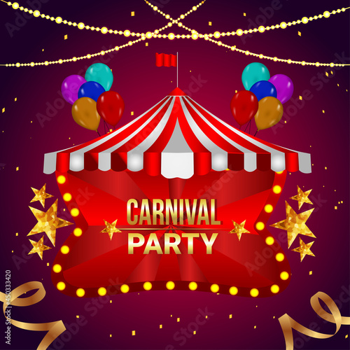Шаблон дизайна плаката турнира по боулингу. Векторная реалистичная иллюстрация шара для боулинга, кеглей, круглого подиума с красной ковровой дорожкой и огнями.