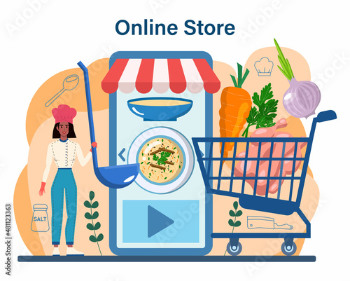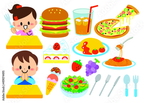 Мальчик смотрит на холодильник с плоской мультяшной векторной иллюстрацией нездорового фаст-фуда. Маленький сын чувствует голод и ищет еду внутри холодильника