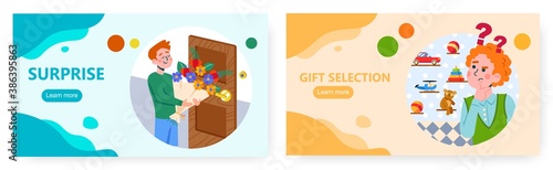 Мальчик пытается выбрать новую игрушку в детском магазине для своего подарка на день рождения. Мужчина с букетом цветов перед дверью. Векторная иллюстрация концепции. Шаблон дизайна веб-сайта.