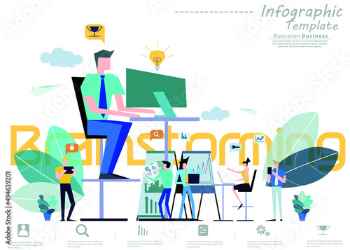 Шаблон веб-сайта целевой страницы мозгового штурма. Векторная плоская иллюстрация. Группа сотрудников, предлагающих новые творческие идеи во время работы над бизнес-проектом или стартапом. Мозговой штурм бизнес-команды.