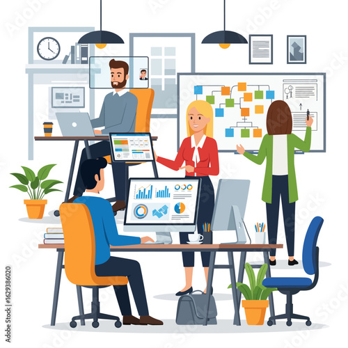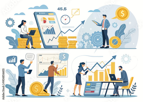 Специалисты по маркетингу мужского и женского пола создают новый бренд компании, повышая узнаваемость бренда, векторная плоская иллюстрация. Брендинговая кампания, маркетинговая стратегия бизнеса.