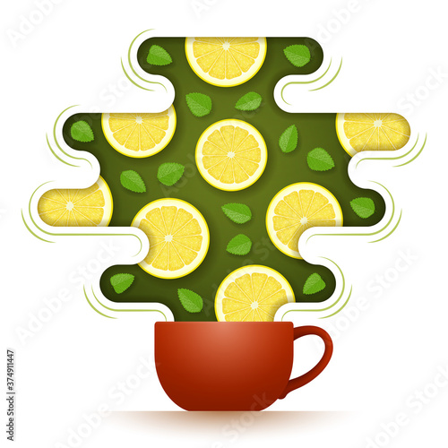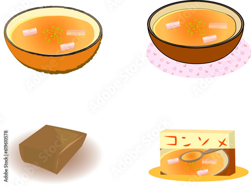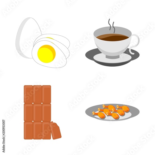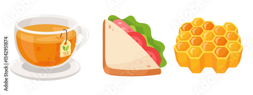 Набор для завтрака. Векторная иллюстрация еды. Дизайн утреннего приема пищи. Жареное яйцо, круассан, апельсин или грейпфрут для еды и кружка с чаем или кофе для питья. Меню для концепции здорового обеда или позднего завтрака