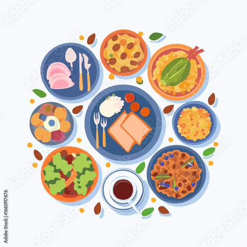 Шаблон баннера плаката "Время завтрака". Векторная иллюстрация в стиле многослойной вырезки из бумаги с видом сверху. Кофейные блинчики, вафли, круассан, яичница-глазунья с помидорами и беконом. Свежие вкусные продукты для завтрака в меню