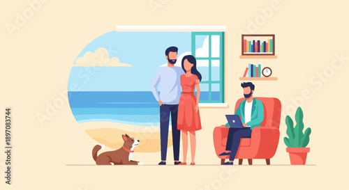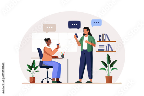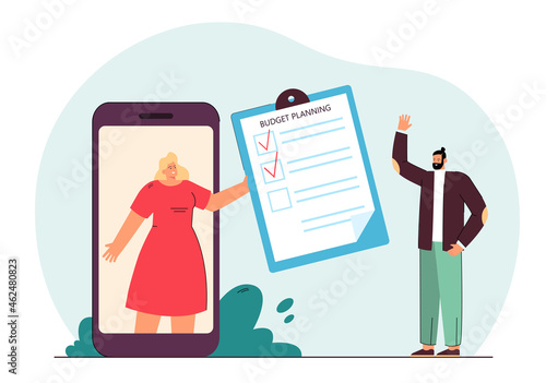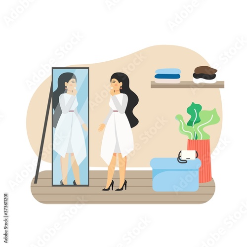 Молодая брюнетка примеряет белое платье перед зеркалом в модном бутике, плоская векторная иллюстрация. Магазин женской одежды, концепция красоты и моды.