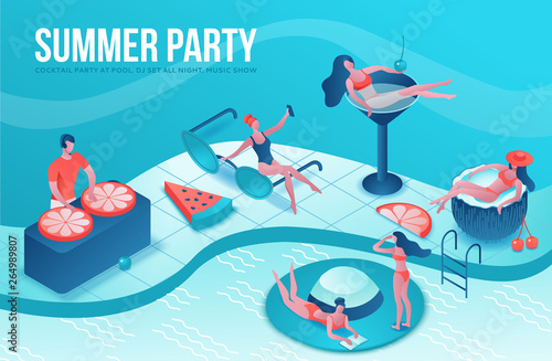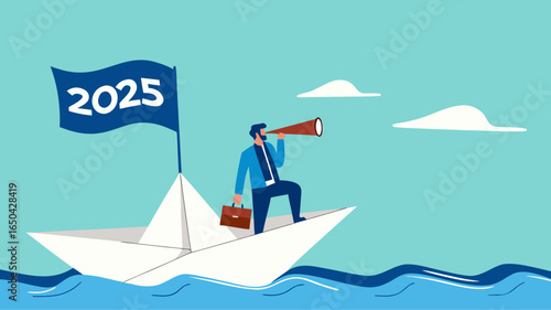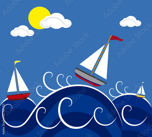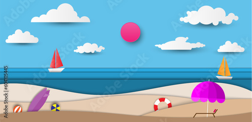 Кистью нарисуйте океан и пляж. Прохладная летняя векторная иллюстрация в стиле paper cut art. Песчаный морской пляжный курорт с зонтиком от солнца, резиновым кольцом в форме пончика и бумажным корабликом в волнах