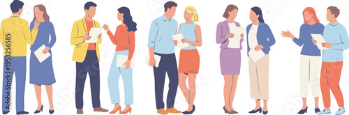 Строитель и архитектор обсуждают векторный значок чертежа, выделенный на белом фоне.