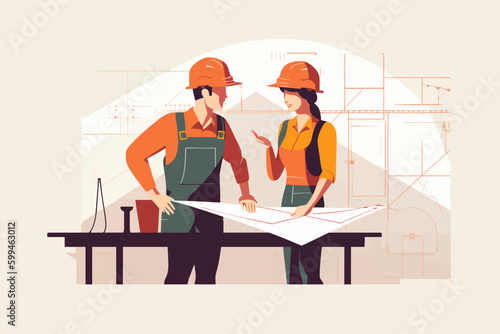 Строитель и архитектор обсуждают проект чертежа на векторном значке ноутбука, изолированном на белом фоне.