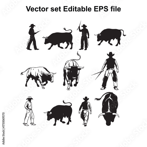 Векторный набор корриды для корриды людей. Публичное традиционное представление в Испании. Значки матадора, быка, красного плаща и пикадора в плоском дизайне