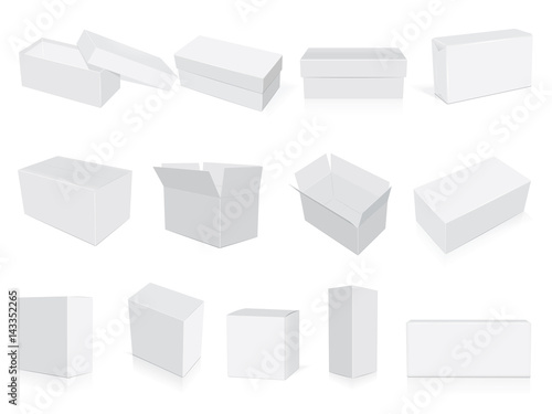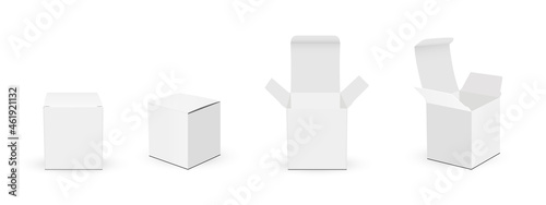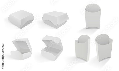 Бургер и картофель фри белая коробка изолированы в реалистичном 3D-стиле. Макет пакета векторной иллюстрации. Белые пустые картонные коробки для фастфуда.