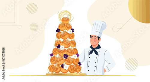 Мужчина в шляпе шеф-повара бургермейкер держит огромный бургер с мясной котлетой, помидорами, яйцом, листьями салата, сыром и кетчупом, векторная плоская иллюстрация. Концепция Burger house для веб-баннера, страницы веб-сайта и т.д.