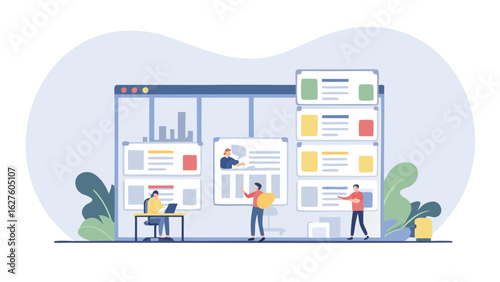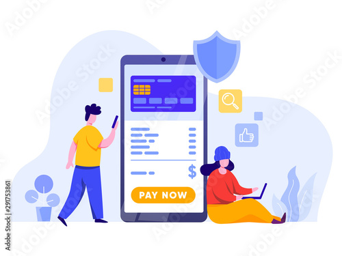 Векторная иллюстрация большого смартфона и крошечных людей женщина с мегафоном, мужчина со знаком продажи. Автобусный тур бронирование билетов онлайн, концепция промо-акции по продаже билетов на автобус для веб-баннера, страницы веб-сайта.