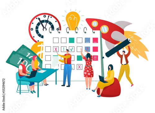 Бизнес-анализ и планирование. Векторная иллюстрация концептуального вида сверху. Деловые люди сидят за столом. Офисная встреча, командная работа, управление проектами, финансовый отчет и стратегия, офисный стол.