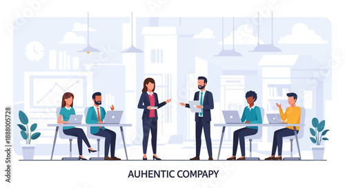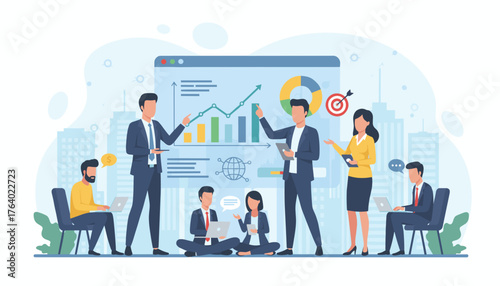 Шаблон веб-сайта целевой страницы бизнес-анализа. Векторная иллюстрация Группа деловых людей, обсуждающих финансовый отчет на рабочем совещании.