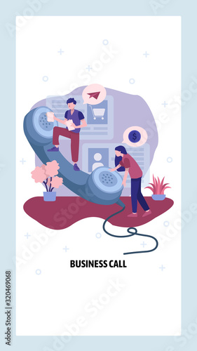 Концепция бизнес-звонка. Телефонные операторы помогают клиенту в центре поддержки. Деловой разговор по телефону. Векторный шаблон дизайна веб-сайта. Иллюстрация концепции сайта целевой страницы.