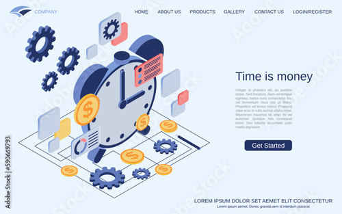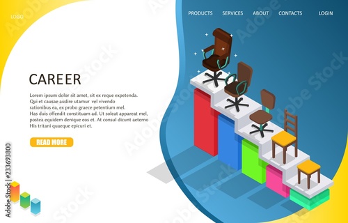 Шаблон веб-сайта целевой страницы для деловой карьеры. Векторная изометрическая иллюстрация карьерной лестницы с различными видами стульев от табурета до офисного кресла босса на вершине