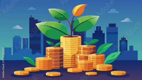 Векторная иллюстрация бизнес-концепции в плоском стиле. Концепция инвестирования денег. Рост денег. Деловой человек поливает денежное дерево. Стопка долларовых монет.