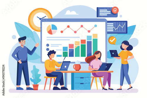 Бизнес-консультант, специалисты по аудиту, анализирующие данные, плоская векторная иллюстрация. Финансовая отчетность или годовой отчет, финансовый аудит и консультационные услуги. Финансы и бухгалтерский учет.