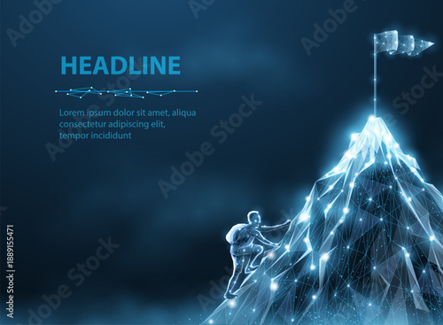 Бизнес-цель, путь к успеху, карьерный путь векторный шаблон дизайна плаката-баннера. Флаг на вершине горы, низкополигональная каркасная сетка. Иллюстрация в многоугольном художественном стиле.