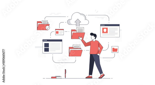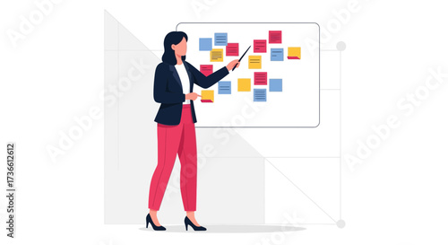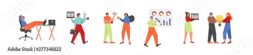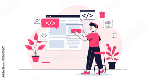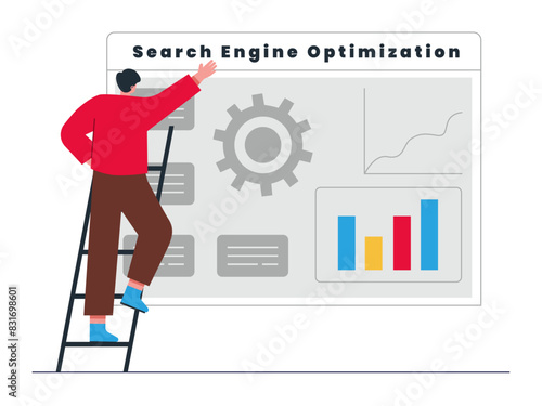Бизнесмен, создающий бизнес-инфографику, векторную иллюстрацию дизайна в плоском стиле. Офисный специалист создает статистическую панель мониторинга и взаимодействует с графиками.