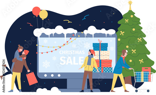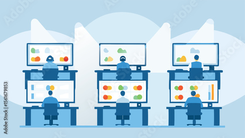 Векторная иллюстрация офисных людей, женщина, работающая на ноутбуке, сидя на большом компьютере, и мужчина, смотрящий в бинокль, стоя на гистограмме. Бизнес-метафорическая концепция веб-баннера.