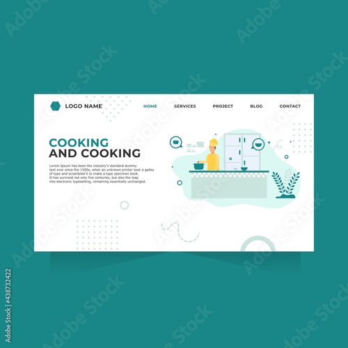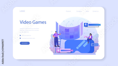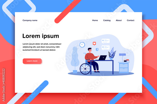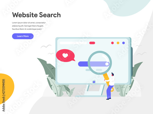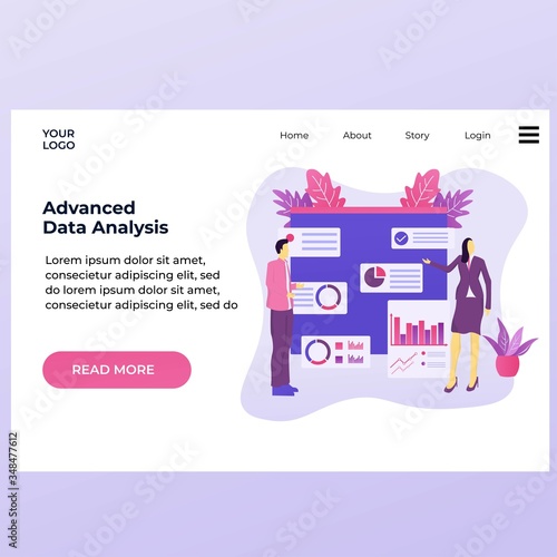 Шаблон целевой страницы Office. Векторная иллюстрация женщины, работающей на ноутбуке, мужчина смотрит в бинокль, большой компьютер, гистограмма. Бизнес-концепция для разработки веб-сайтов и мобильных сайтов.