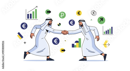 Деловые партнеры пожимают друг другу руки. Переговоры с арабским бизнесменом о поставках нефти, плоская векторная изометрическая иллюстрация. Международное нефтяное соглашение, деловое рукопожатие, партнерство.
