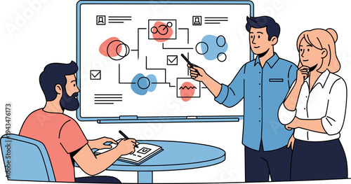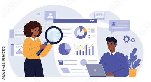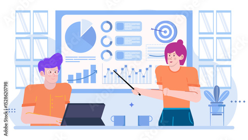 Деловые люди, буфер обмена с контрольным списком, часы. Женщина проверяет список дел, мужчина показывает рукой знак "Ок", плоская векторная иллюстрация. Управление задачами, планирование, тайм-менеджмент.