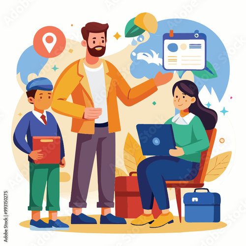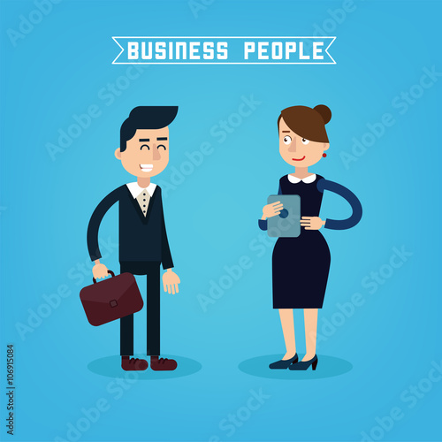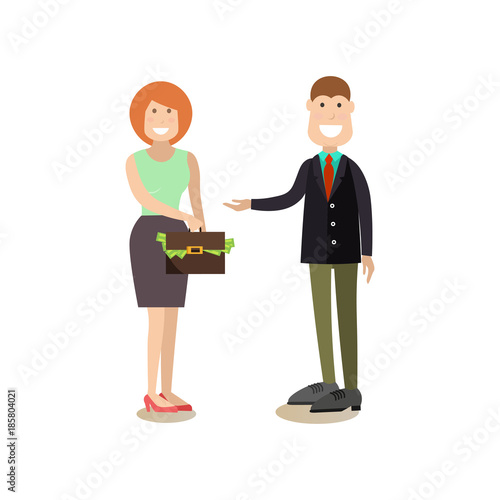 Векторная иллюстрация бизнесвумен, дающей бизнесмену портфель, полный бумажных денег. Элементы дизайна в плоском стиле деловых людей, значки, выделенные на белом фоне.