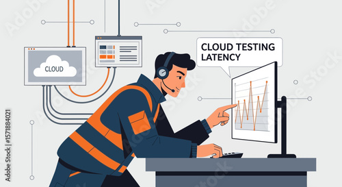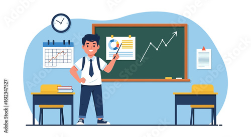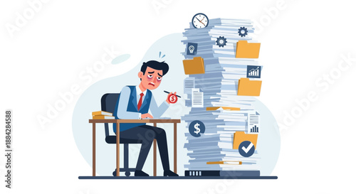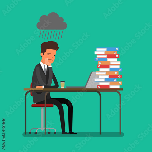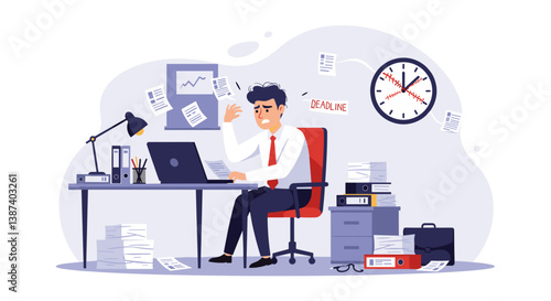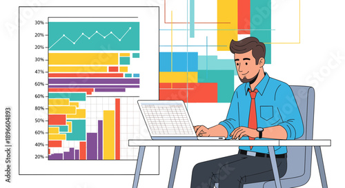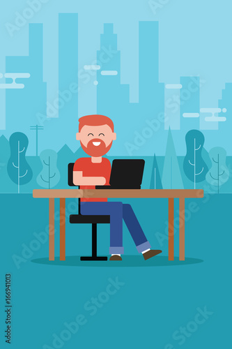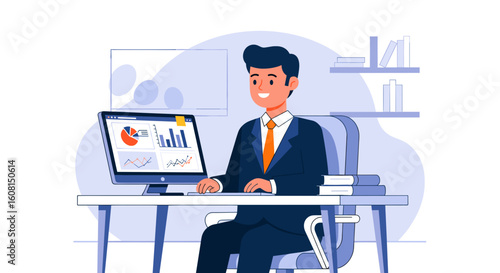 Векторная иллюстрация счастливого офисного работника мужского пола, сидящего за офисным столом и использующего ноутбук. Элемент дизайна в плоском стиле деловых людей, значок, выделенный на белом фоне.