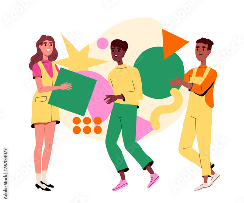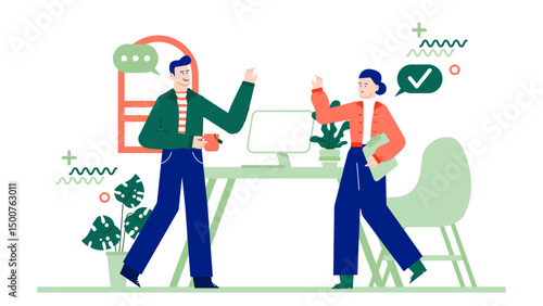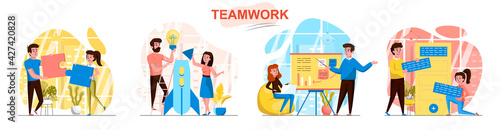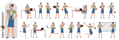 Набор иконок деловых людей, векторная иллюстрация дизайна в плоском стиле. Офисные работники идут на работу, проводят презентацию, заключают сделку, работают в коворкинге.