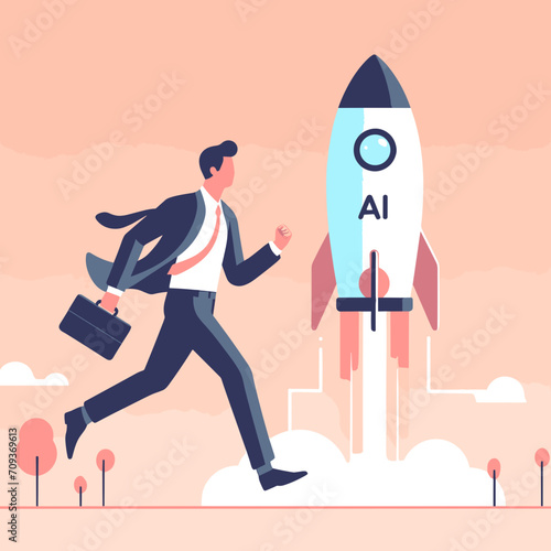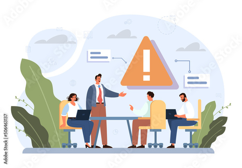 Деловые люди смотрят на летящую ракету, плоская векторная иллюстрация. Запуск космической ракеты, концепция запуска нового бизнес-проекта.
