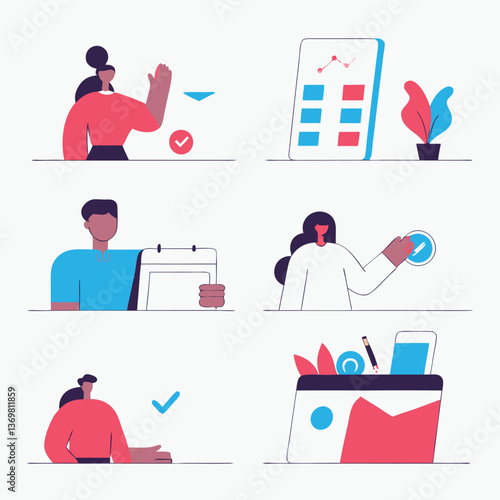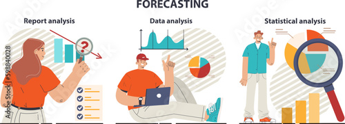 Деловые люди, персонажи мужского и женского пола, взаимодействующие со стрелкой, столбиком, свечными графиками биржевой торговли, круговой диаграммой, плоской векторной изолированной иллюстрацией. Анализ данных, бизнес-аналитика, фондовый рынок