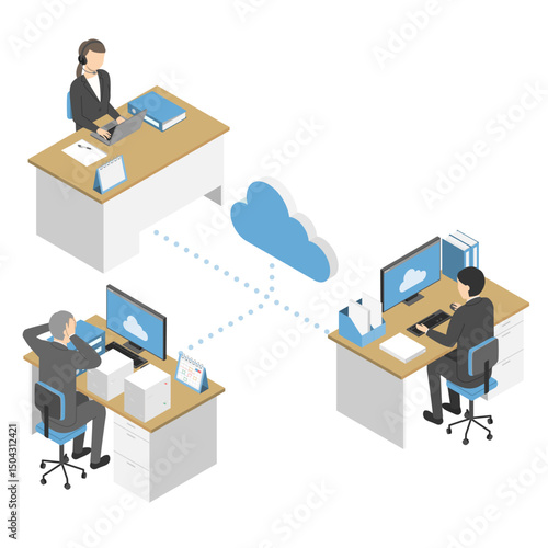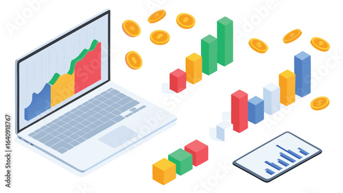 Деловые люди, работающие на портативных компьютерах, сидят на круговой диаграмме, плоская векторная изометрическая иллюстрация. Анализ финансовых данных и бизнес-статистика.