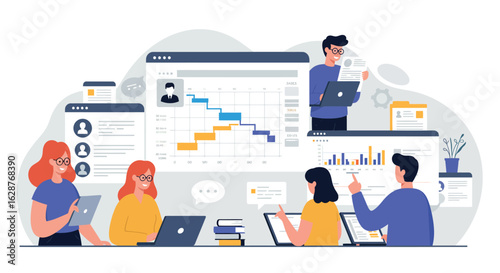 Деловые люди, работающие на портативном компьютере, используя мобильный телефон, сидя за столом, в кресле-мешке, плоская векторная изолированная иллюстрация. Офисная работа, фриланс, домашний офис.