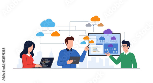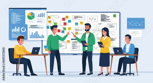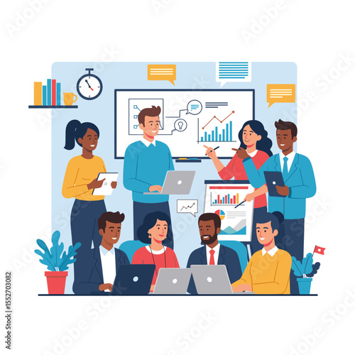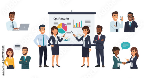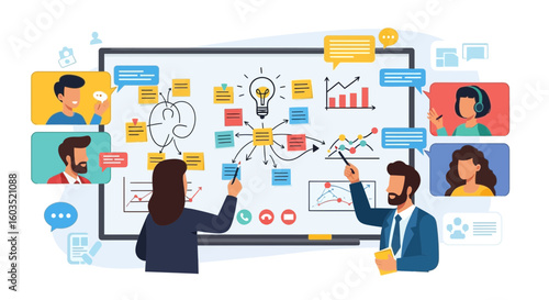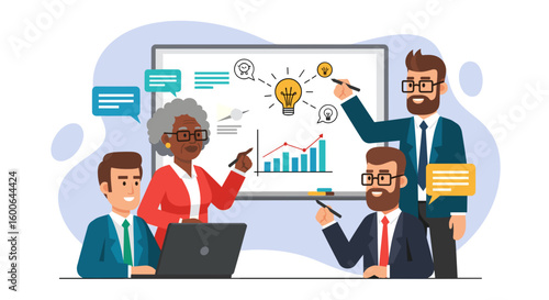Огромный смартфон с бизнесменом, дающим онлайн-презентацию, векторная плоская иллюстрация. Вебинар на мобильном устройстве, удаленная презентация, онлайн-бизнес-конференция, совещание.