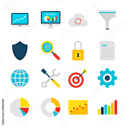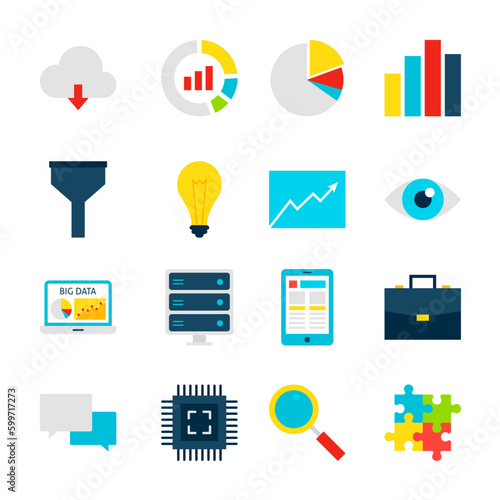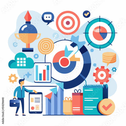 Иллюстрация векторного 3d-дизайна значка запуска бизнес-проекта. Ракетный магазин, лампочка идеи, панель диаграммы графика, стрелка, речевой пузырь чата сообщений, лупа, кредитная карта, денежный символ, мишень для прицеливания дротиков
