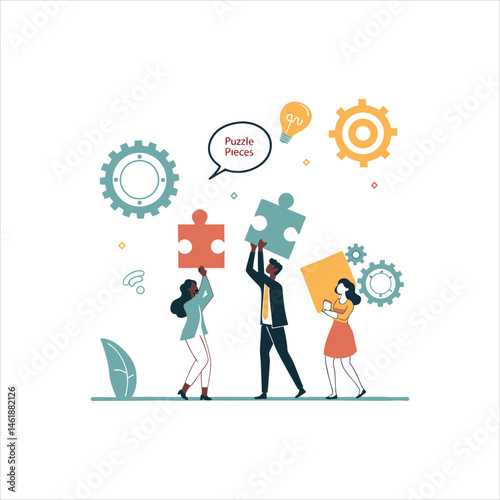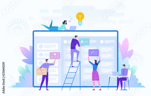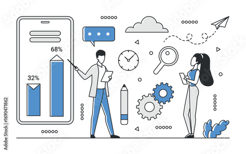 Огромный человеческий мозг, деловые люди, микро-мужские и женские персонажи с лампочкой, мобильным телефоном, лупой, векторной иллюстрацией. Запуск бизнеса, запуск идеи, концепция мозгового штурма.