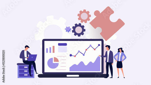 Алмаз на огромном экране монитора компьютера и микро-мужские и женские персонажи с гаечным ключом, отверткой, мобильным телефоном, ноутбуком, векторной иллюстрацией. Концепция запуска бизнеса для веб-баннера, страницы веб-сайта.