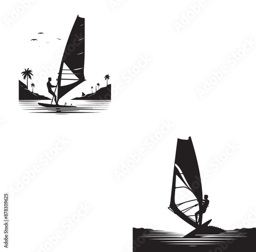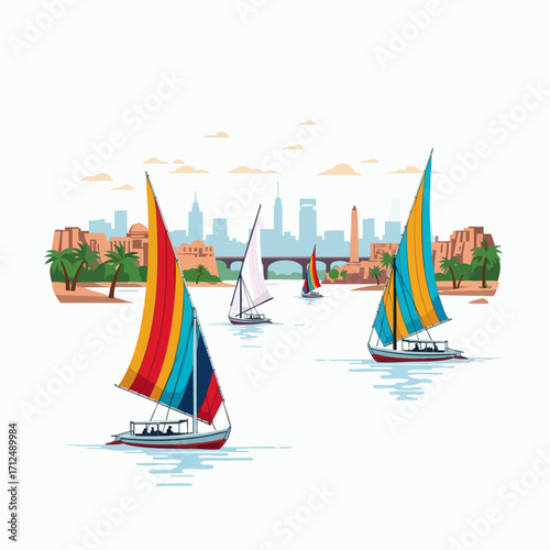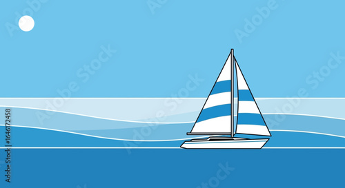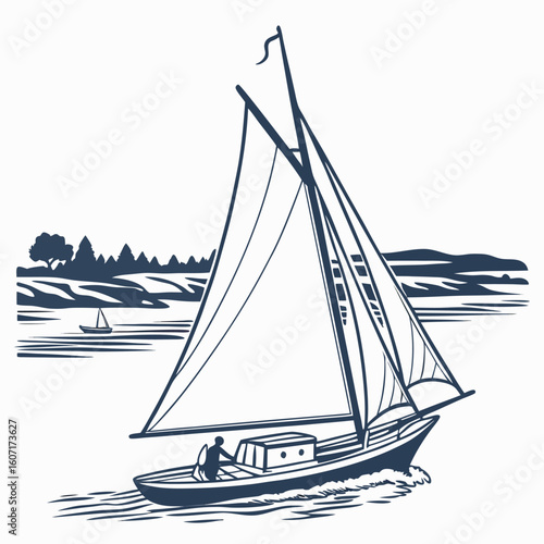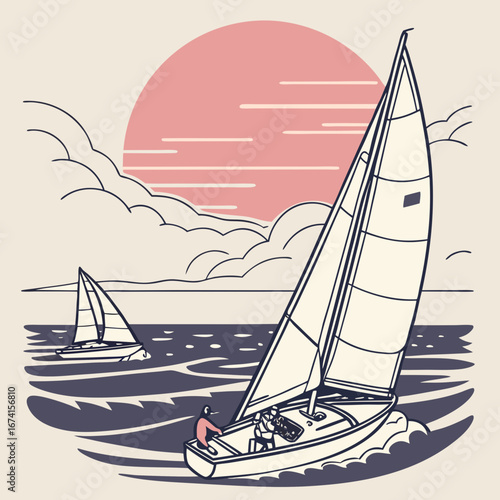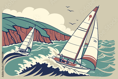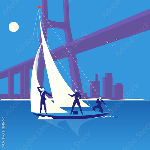Векторная иллюстрация трех бизнесменов, плывущих на лодке. Один человек смотрит вперед. Парусная регата. Деловая конкуренция, видение, концепция командной работы дизайн в плоском стиле.