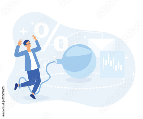 Векторная иллюстрация бизнесмена с красной лентой, убегающего от поезда с надписью корпорации. Он сталкивается с опасностью. Элемент дизайна концепции бизнес-риска в плоском стиле