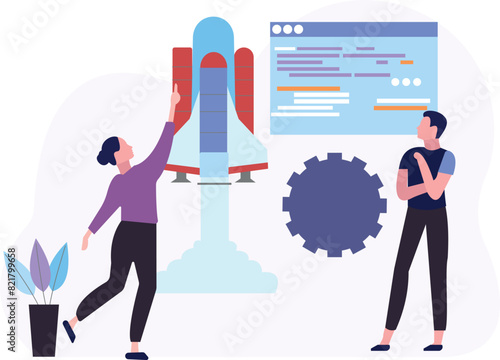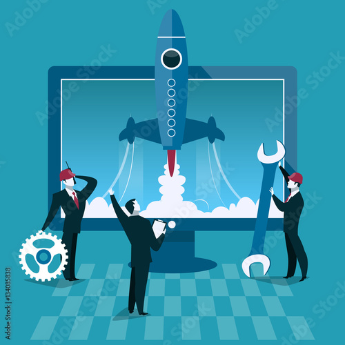 Векторная иллюстрация концепции запуска бизнеса. Запуск ракеты и компьютер на заднем плане. Бизнесмен открывает новую компанию.