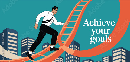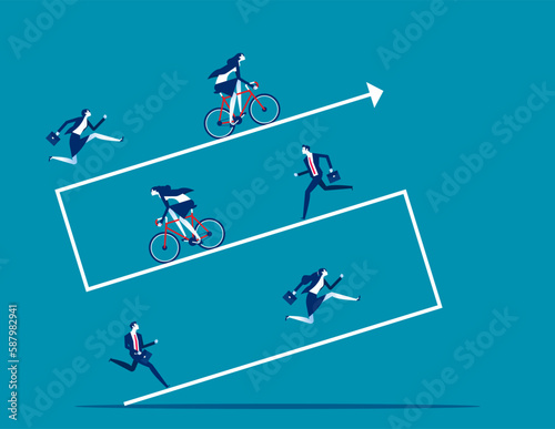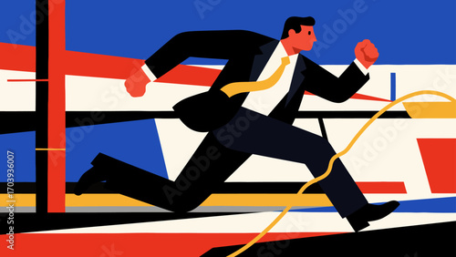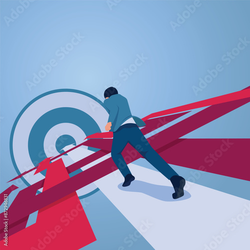 Векторная иллюстрация бизнесмена, преодолевающего такие трудности, как бег с препятствиями. График, показывающий рост бизнеса.