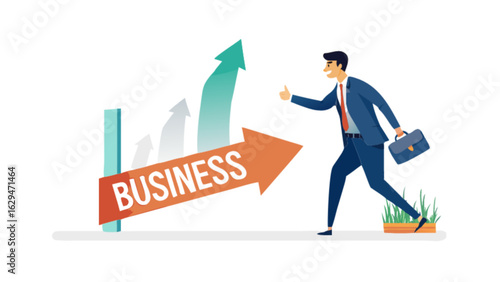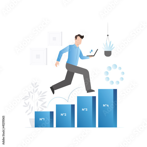 Бизнесмен взбирается на растущую гистограмму, держа деньги в поднятой руке, векторная плоская иллюстрация, изолированная на белом фоне. Концепция успеха в бизнесе для веб-баннера, страницы веб-сайта и т.д.