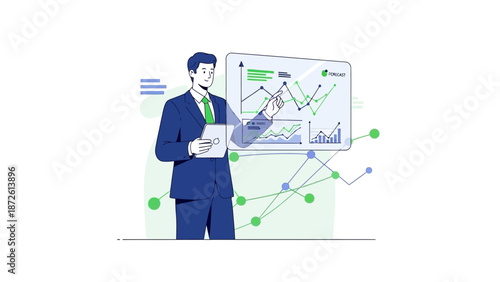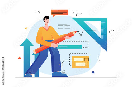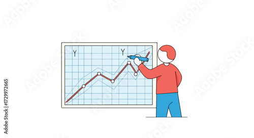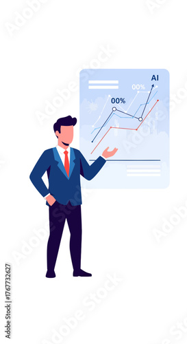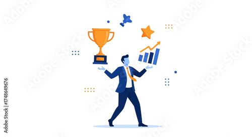 Бизнесмен, рисующий график растущей стрелки, ведущий к кубку победителей, векторная плоская иллюстрация, изолированная на белом фоне. Успех в бизнесе, концепция стратегии планирования для веб-баннера, страницы веб-сайта.
